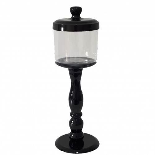 Baleiro com pé torneado e tampa em metal na cor preta.